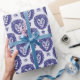 Un emballage cadeau avec une illustration de têtes de lions bleus et de symboles abstraits. C'est un grand enveloppement pour les garçons ou les amateurs de luxe.