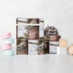 A gray mouse in a pink turtleneck holds a warm cup of coffee and gazes out the snowy farmhouse window, soaking in the serene winter landscape
