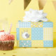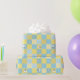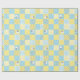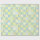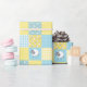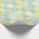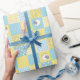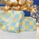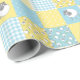 Un rouleau de papier d'emballage d'amusement, avec une conception de patchwork de Faux des motifs et des motifs de moutons dans les bleus et les jaunes, teamed avec les guingans de contrôle et les points de polkas coordonnés.