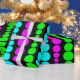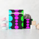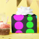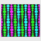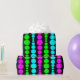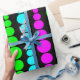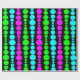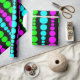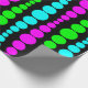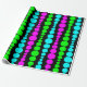 Ce papier d'emballage a une conception moderne du milieu du siècle de rectangles ronds rose, vert et bleu néon, de taille croissante et décroissante, fonctionnant verticalement sur un champ de noir.