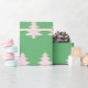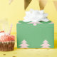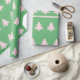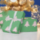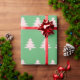 Un motif d'arbres de Noël rose pâle apparaît sur ce papier d'emballage vert.
