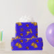 Un papier d'emballage festif de Noël avec un motif de rennes d'or, des cloches de Noël, un saint d'or aux baies rouges de rubis et des flocons d'or sur un arrière - plan bleu coloré.
