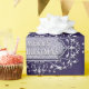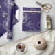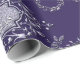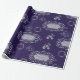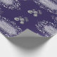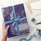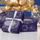 Un élégant papier d'emballage de Noël bleu et argent, il présente un motif décoratif d'éléments festifs et argentés. Il y a aussi de grandes enseignes ornementales avec "Joyeux Noël" en argent ainsi que des décorations métalliques de Noël comme des baubles, des couronnes de Noël en argent et des colombes de la paix en argent avec une branche de saint d'argent dans leurs becs.
