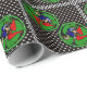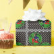Noël élégant font un paquet cadeau de comporter la variation originale d'IconDoIt sur un caractère d'elfe de Maxfield Parrish d'ère de pre-WWI avec les guêtres rouges et noires du père noël de polka de point sur une expression entourée par cercle vert "Joyeux Noël de Kelly w/repeating !" Arrière - plan de blanc au pois et aux frontières noirs de damier.