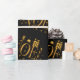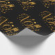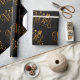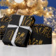 Un papier d'emballage de Noël noir et or très élégant et contemporain, avec un motif de typographie or de la traditionnelle salutation festive de "Noel", répété en diagonale sur un arrière - plan noir. Le lettrage doré présente des éléments ornementaux amusants tels que des boîtes cadeaux de Noël en or, des sucres de canne en or, des flocons de neige et des étoiles en or.