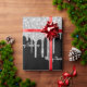 Elégant, classique, glamour et de style féminin papier d'emballage de fête pour Noël. Un arrière - plan noir décoré de faux parties scintillant argentées goutte à goutte et scintille, un arc argenté et un ruban. Avec le texte : Joyeux Noël. Lettres gris clair.