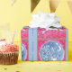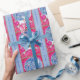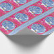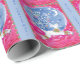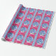 L'abstraite image rétro sur ce papier cadeau de Noël est unique. Il est orné d'un joli renne argenté habillé de vert et de rouge, et d'une variété d'ampoules de Noël colorées suspendues à ses énormes bois. Le cerf se promène devant un ciel bleu circulaire de nuit, avec lune et étoiles en croissant. L'image est placée sur un arrière - plan rose vif bordé de bleu assorti. Le texte "Joyeux Noël !" est dans la frontière bleue.