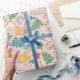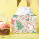 Papier d'emballage de vacances adorable avec biscuit sucré stylisé arbres de Noël, bonhomme de neige, sucres de canne et cloches, sur rose doux
