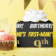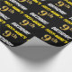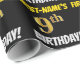 Ce papier d’emballage comporte un message comme "FIRST-NAME’S 9th BIRTHDAY!", avec le "9th" ayant une apparence de couleur fausse/imitation or, et avec le nom et "BIRTHDAY" dans une police amusante et audacieuse. Le nom peut être personnalisé, et l'arrière - plan est de couleur noire. Un papier comme celui-ci pourrait peut-être être utilisé pour envelopper les cadeaux d'anniversaire donnés à quelqu'un pour célébrer son neuvième anniversaire. [~Z0000203]