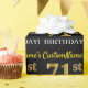 Ce design papier d’emballage comporte un message comme "71e ANNIVERSAIRE de CustomName!", avec le "71e" ayant une apparence de couleur fausse/imitation or. Le nom peut être personnalisé, et l'arrière - plan est de couleur noire. Il pourrait peut-être être utilisé pour envelopper les cadeaux donnés pour le soixante-et-onzième anniversaire de quelqu’un. [~Z0000177]
