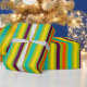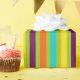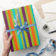 Ce papier d'emballage lumineux comporte les rayures audacieuses aux nuances de vert, de pourpre, d'orange, de bleu et de jaune de notre nouvelle rétro palette de couleurs.
