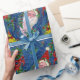 Peinture acrylique colorée, lunatique et artistique pour Noël. Santa Claus, soirée d'hiver musicale enneigée avec ornements floraux, plantes décoratifs verts, rubans rouges, baies sèches, champignons, marionnettes et jouets dans la neige par Bulgan Lumini (c)