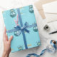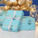 Beau papier moderne d'emballage cadeau avec le Joyeux Noël écrit. Bleu argenté, turquoise avec le grand ornement avec l'arc. Or de Faux JOYEUX. Personnalisez avec le nom. Impressionnez vos amis et famille avec ce document luxueux d'emballage cadeau. (la couleur d'arrière - plan peut être changée en n'importe quelle couleur)