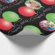 Ce papier d'emballage de Noël présente deux ornements traditionnels ronds de Noël, un rouge et un vert dans un motif sur un arrière - plan noir et les mots Joyeux Noël. Cinq des ornements sur toute la longueur du papier sont des cadres photo personnalisables, vous permettant d'ajouter vos photos de famille préférées.