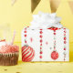 Ce papier d'emballage présente un motif répétitif d'ornements de Noël rouges et blancs accrochés à des cordes verticales de perles rouges. De petites étoiles rouges stylisées parsèment l'arrière - plan blanc. Certains ornements sont en rouge massif, d'autres en rayures rouges et blanches.