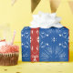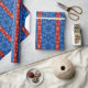 Seamstress, quilters et tous ceux qui aiment la couture et l'artisanat apprécieront ce papier d'emballage rouge et bleu plein d'images du cabinet de couture. Fer, aiguilles, ciseaux et rack de briques sur un arrière - plan floral féminin.