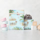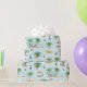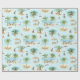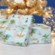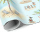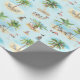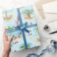 Ce papier d'emballage de Noël tropical rétro présente un motif de scènes de plage de vacances avec des palmiers décorés de lampes à cordes colorées et des transats surplombant l'eau, entrecoupés de flamants roses dans des chapeaux de santa, et des mouettes perchées sur des pilons décorés, sur un arrière - plan bleu turquoise clair.