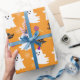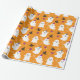 Papier à envelopper pour Halloween. Le fond est Orange avec un motif qui combine des fantômes, des sorcières casquettes, des lollypops et des figurines de flocons de neige.