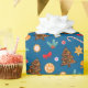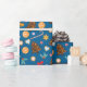 Envelopper le papier avec un motif du Nouvel An, de jolies photos de bonbons, de sucettes et de biscuits de pain d'épice, d'arcs et de feuilles sur un arrière - plan bleu.