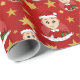 Papier d'emballage de Noël avec l'illustration d'un joli garçon au gingembre souriant et joyeux, il porte un costume de Père Noël rouge et blanc et tient un cadeau; avec le texte modifiable modèle pour votre nom ou message, le design des fêtes de Noël avec un arrière - plan rouge transparent avec étoiles