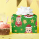 Papier d'emballage de Noël avec l'illustration d'un joli garçon au gingembre souriant et joyeux, il porte un costume de Père Noël rouge et blanc et tient un cadeau; avec le texte modifiable modèle pour votre nom ou message, le design des fêtes de Noël avec un arrière - plan vert transparent avec étoiles