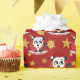 Papier d'emballage de Noël Design personnalisé avec illustration d'une tête de panda mignon avec casquette Père Noël, en cercle rouge, avec motif jaune avec étoiles, conception de vacances de Noël pour enfants, avec modèle texte personnalisable pour votre nom ou message; illustré par Radka Kavalcova