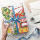 Papier d'enveloppement de conception personnalisée avec une finition mate Design de marché de Noël avec la famille s'amusant pendant les achats de Noël