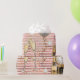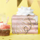 Le soir du Nouvel An ou le jour de l'an envelopper d'or sur un arrière - plan rose à rayures en faux feuille d'or, avec ballons, feux d'artifice, lunettes de champagne et horloge. Offrez à vos invités de la fête ou à votre autre personne importante quelque chose de spécial pour célébrer l'année à venir. Or et or rose.