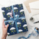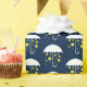 Envelopper le papier avec un motif de avec un parapluie blanc qui se pare de citrons souriants et de feuilles verts sur un arrière - plan bleu.