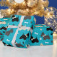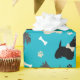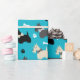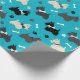 Chiens écossais mignons, noirs, gris et roux, avec des arcs, avec des empreintes et des os de chien sur un arrière - plan bleu.