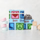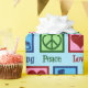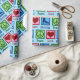 Papier d'emballage pour patinage sur glace mignon pour un patineur artistique avec un signe de paix, un coeur et des patins sur glace. Pretty PEACE LOVE ICE SKATING en bleu.