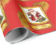 Beau papier d'emballage de Noël en couleur rouge et franges dorées avec le Père Noël en cadre doré souhaitant "Joyeux Noël".Vous pouvez personnaliser le texte aussi bien que vous préférez.