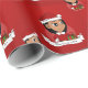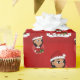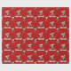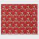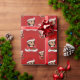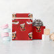 Papier enveloppant avec l'illustration d'une jolie petite latino-hispanique ou asiatique souriante, mignonne, avec de longs cheveux noirs, vêtue de vêtements de Noël, portant un casquette du Père Noël rouge et tenant un cadeau ; dessin de Noël sur un arrière - plan rouge