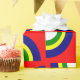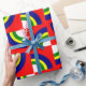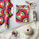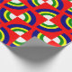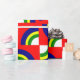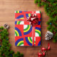 Ce papier d'emballage a une conception Bauhaus de quarts de cercles en bleu, jaune, vert et blanc sur un champ de rouge.