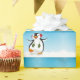 Une jolie illustration hivernale : un manchot avec des gants et un écouteur de bonne humeur marche dans la neige.