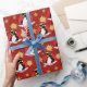 Papier d'emballage de Noël avec l'illustration d'un mignon pingouin crêpé avec un chapeau de Père Noël rouge ; dessin animé de Noël pour les enfants ; dessin animé de Noël pour les enfants, sur arrière - plan rouge avec modèle texte personnalisable pour votre nom ou message ; illustré par Radka Kavalcova
