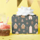 Whimsical Christmas theme wrapping paper featuring illustration of gingerbread houses with pink accent.