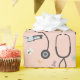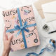 Charming seamless pattern wrapping paper featuring the word Nurse with medical essentials like stethoscopes, syringes, medicine bottles, and nurse cups on a soft pink background. This playful healthcare-inspired design blends feminine colors with nursing-themed elements, making it ideal for nurses, nursing students, healthcare workers, and medical professionals.