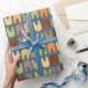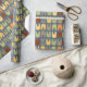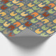 A pattern of abstract bunny-shaped silhouettes arranged in neat rows, featuring warm orange, yellow, olive green, and brown tones on a muted blue-gray background.