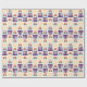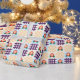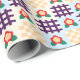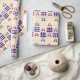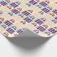 A grid pattern combining stylized flowers, checker textures, and bold hash-like shapes in soft cream, blue, red, green, and purple tones.
