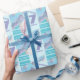 Bleu mignon cheval poney, aqua, papier cadeau d'anniversaire à rayures violettes. Customisez avec vos enfants nom et âge. Il lit actuellement Charlotte 7 aujourd'hui. OEuvre d'aquarelle et graphismes peints par Sarah Trett www.sarahtrett.com pour www.mylittleeden.com
