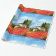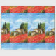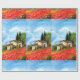Paysage toscan, coloré, vibrant, beauté expressive de la campagne italienne et champs de pavot rouge, belle flore estivale en vert clair, jaune, marron, bleu, couleurs blanches, prés, champs de fleurs, cyprès et oliviers, ancienne ferme rustique sous le ciel bleu et les nuages blancs.Peinture acrylique sur toile.