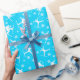 Ajoutez une touche amusante aux cadeaux pour skieurs avec ce papier d'emballage à motifs. Il présente des illustrations de skieurs faisant des tours de ski ainsi que des flocons de neige. Les graphiques blancs sont placés contre un arrière - plan bleu vif.