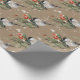 Un papier d'emballage de Noël Kraft avec des oiseaux casquettes noirs peints en aquarelle sur une branche d'épinette verte avec des baies blanches et rouges dans un motif répétitif sur du papier couleur Kraft.