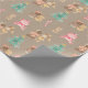 Le premier papier cadeau de Noël d'une petite fille avec un arbre de Noël aquarellé, des blocs en lettres, des poupées vintages, des nounours rouges et des sucres de canne dans un ensemble de trois feuilles de la même image sur un arrière - plan kraft couleur.