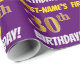 Ce papier d’emballage comporte un message comme "FIRST-NAME’S 30th BIRTHDAY!", avec le "30th" ayant une apparence de couleur fausse/imitation or, et avec le nom et "BIRTHDAY" dans une police amusante et audacieuse. Le nom peut être personnalisé, et l'arrière - plan est violet coloré. Un papier comme celui-ci pourrait peut-être être utilisé pour envelopper les cadeaux d'anniversaire donnés à quelqu'un pour célébrer leur trentième anniversaire. [~Z0000206]
