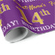 Ce design papier d’emballage comporte un message comme "14e anniversaire de prénom!", le "14e" ayant une apparence de couleur fausse/imitation or. Le nom peut être personnalisé, et l'arrière - plan est violet coloré. Il pourrait peut-être être utilisé pour envelopper les cadeaux donnés pour le quatorzième anniversaire de quelqu’un. [~Z0000182]