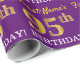 Ce design papier d’emballage comporte un message comme "95e anniversaire de prénom!", le "95e" ayant une apparence de couleur fausse/imitation or. Le nom peut être customisé, et l'arrière - plan est violet coloré. Il pourrait peut-être être utilisé pour envelopper les cadeaux donnés pour le quatre-vingt-quinzième anniversaire de quelqu’un. [~Z0000182]