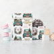 Un pick-up bleu turquoise transporte un arbre de Noël décoré et des paquets cadeaux sur ce joli papier d'emballage cadeau. Un chien de berger australien, un merle rouge, regarde du hayon arrière. Un panneau en bois rustique sur le pare-chocs arrière dit "Cheer de Noël". Votre monogramme est entouré d'un joli cône de pin et d'une couronne de baies rouges, et le texte en or stylisé dit "Joyeux Noël". Vous pouvez également customiser "de la section (Nom).