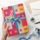 Wrap your gifts with this retro-style, textural type in bright, colorful combination wrapping paper and spread modern holiday cheer this season. This pattern features squares of aqua blue, mustard yellow, blush, red, fuchsia pink and purple and gives a little graphic punch to your pile of presents under the tree.